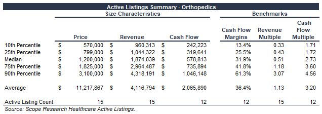 There are a number of small orthopedic practices listed for sale at any given time, but it's difficult to glean much useful information from data on smaller businesses where context around the level of owner involvement is unavailable. An orthopedic practice making $500k per year in cash flow for an absentee owner is much different from an Orthopedic practice making $500k per year in take-home for a full-time owner-operator. Our study of current and recently removed businesses for sale shows a range of multiples from 1.72x cash flow to 3.6x cash flow at the 25th and 75th percentiles, with a median of 2.73x.